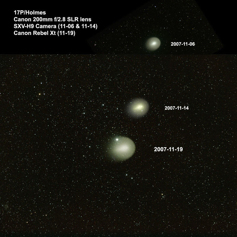 Managed to squeeze out 15 minutes of data as 17P/Holmes passed near Alpha Persei. Also shown are previous images I took from 11/06/2007 and 11/14/2007.