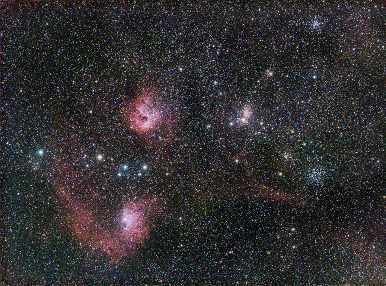 (Click to enlarge) An approximately 7 degree wide shot of Auriga including the nebulae IC 405 and IC410, as well as several open clusters. I really fought with the light pollution on this one and didn't quite handle all the color issues. However there is quite alot of nebulosity in this area so it turns out to be a much nicer shot than I had original thought it would be.