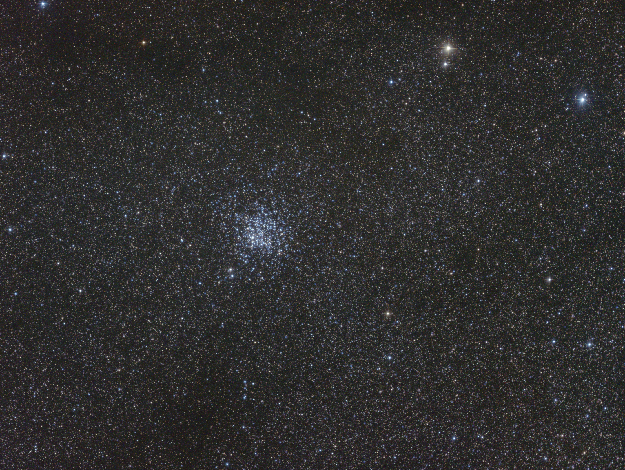 (Click to enlarge) This image © Copyright 2018, Michael Fulbright I was out giving INDI/Ekos a test run and grabbed some quick data of one of my favorite open clusters. Date: 06/28/2017 Telescope: Teleskop-Service ONTC 8" f4 Mount: Astro-Physics Mach1GTO Camera: ZWO ASI1600MM-Cool Exposure: Baader B 1.25" CCD Filter: 50x15" (gain: 139.00) -10C bin 1x1, Baader G 1.25" CCD Filter: 50x15" (gain: 139.00) -10C bin 1x1, Baader R 1.25" CCD Filter: 50x15" (gain: 139.00) -10C bin 1x1