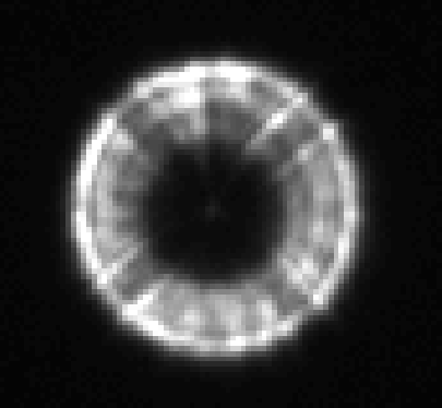I setup on a bright star and defocused until I had a donut around 64 pixels across. I am using an SXV-H9 CCD camera and Maxim DL. I set Maxim DL to take continuous focus frames and then started adjusting the primary screws until I had a reasonably symmetric looking donut: